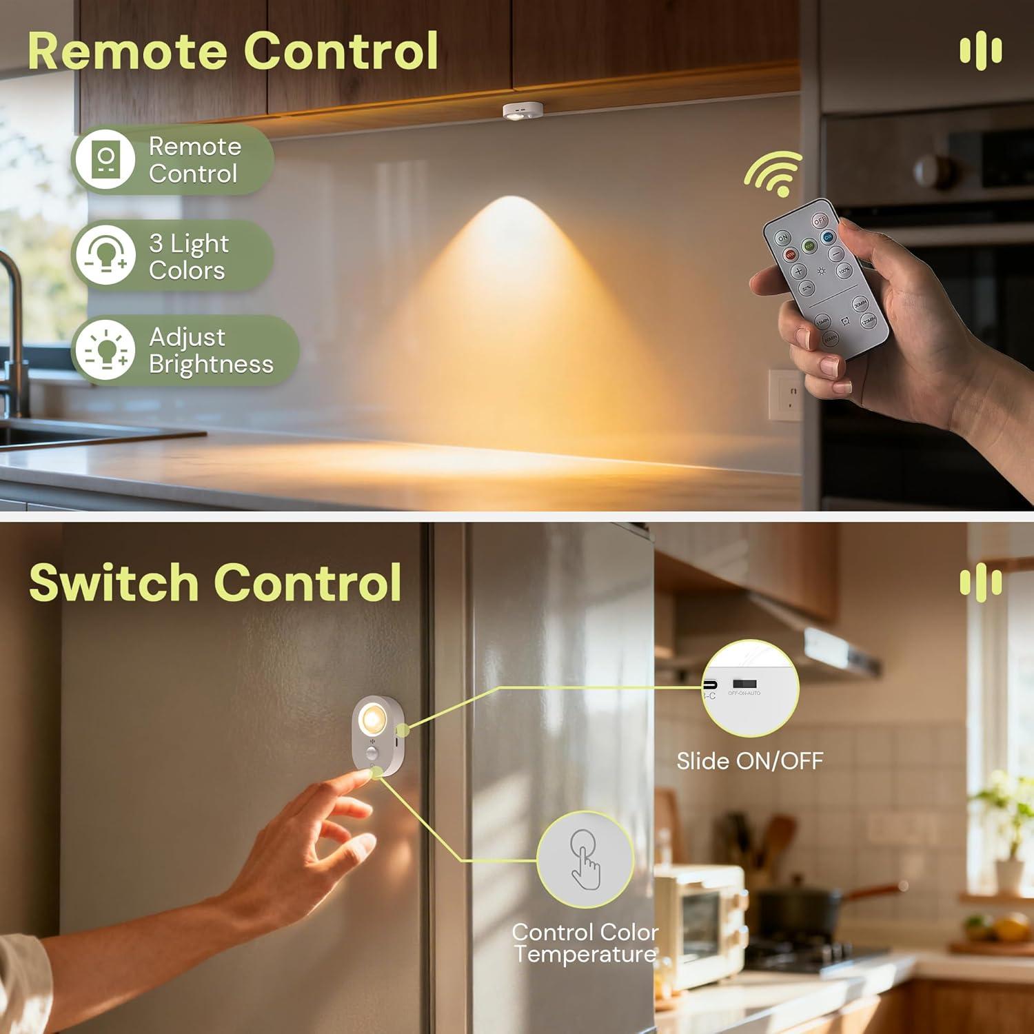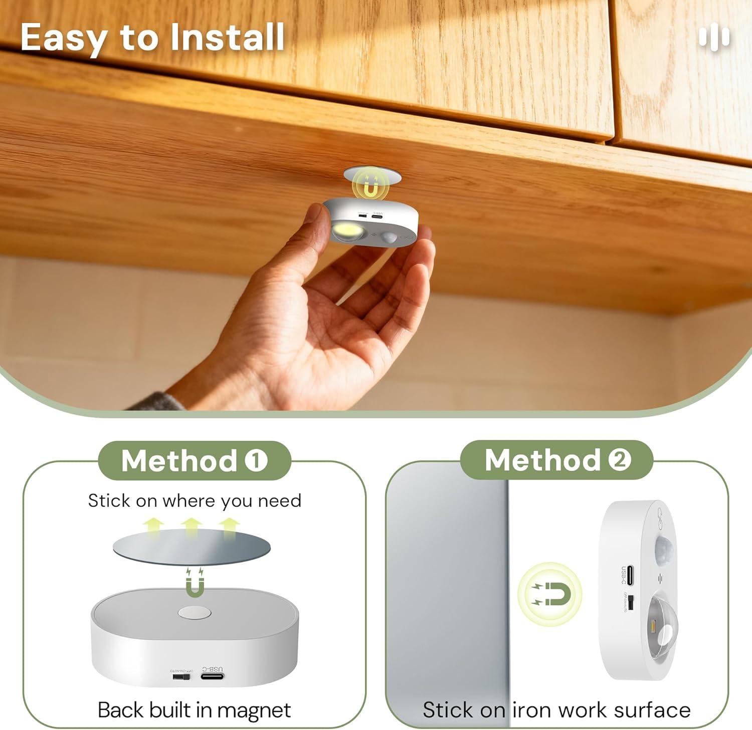【Easy Stick-On Installation & Magnetic Design】Each puck light includes built-in strong magnets for direct attachment to metal surfaces or adhesive metal plates for flexible placement. Lights are easily removable for charging and repositioning. Ideal for cabinets, closets, under counters, bedside tables, desks, or any area requiring versatile lighting.