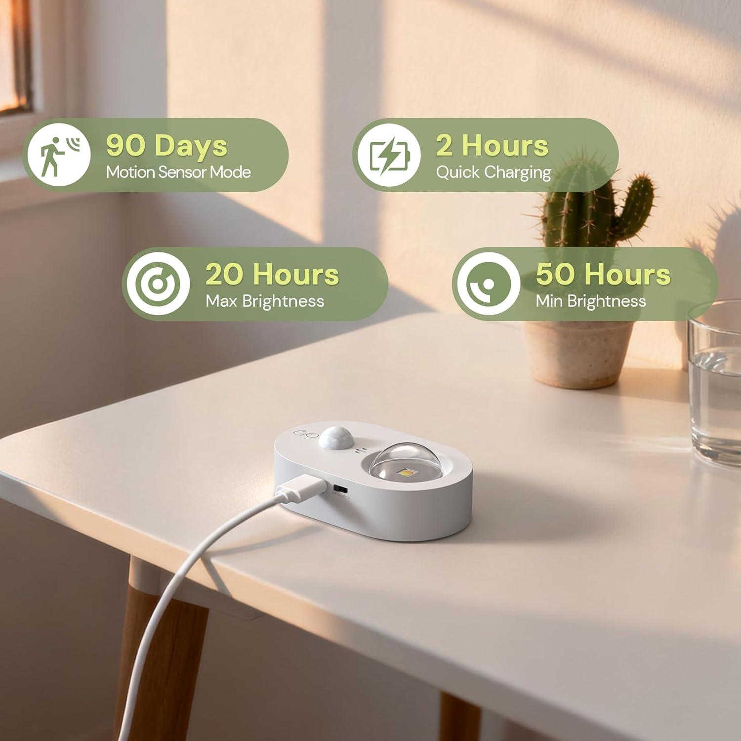 【Rechargeable Wireless Cabinet & Counter Lights】Built-in rechargeable batteries provide a reliable lighting solution without constant battery replacement. Charge easily via the included USB cable. When fully charged, the lights last up to 6 hours in continuous mode or up to 30 days when used in motion sensor mode, making them energy-efficient and eco-friendly.