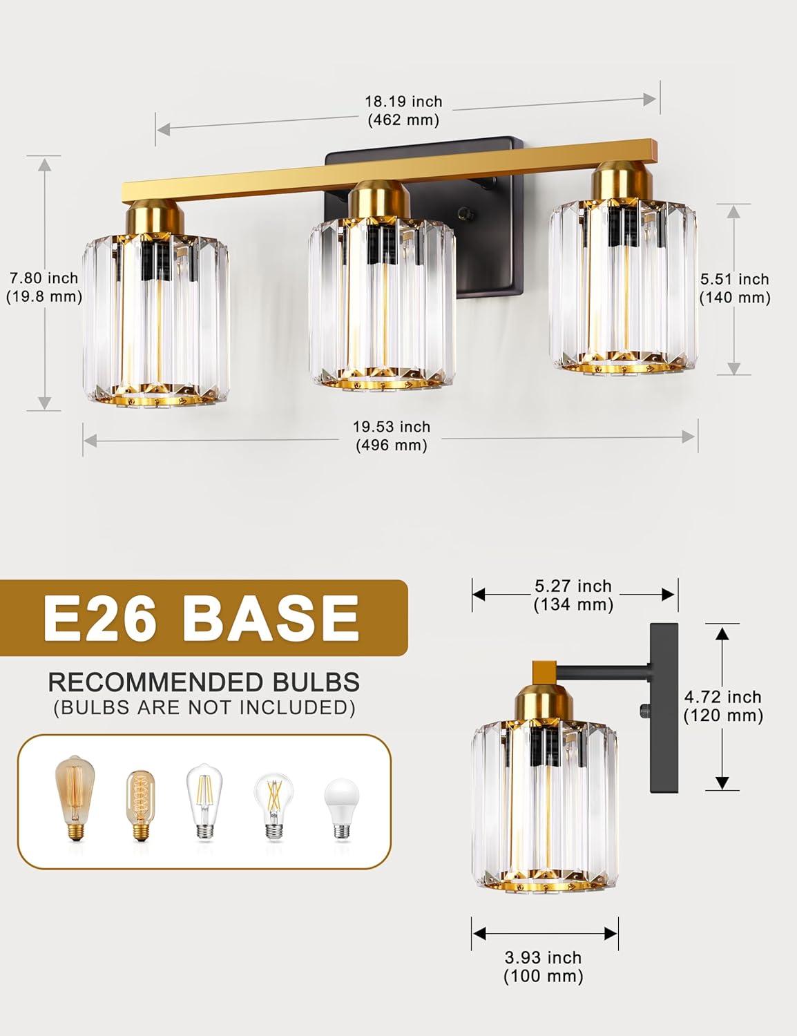 BULB SPECIFICATIONS: The bathroom vanity lights can be equipped with 3 x E26 base bulbs (up to 40W each). It is advisable to opt for a 40W equivalent G16.5/G14/B11/CA11/S14/C37 vintage filament-style bulb. Bulbs exceeding a height of 3.94 inches are not supported. (Bulbs are not included.)
