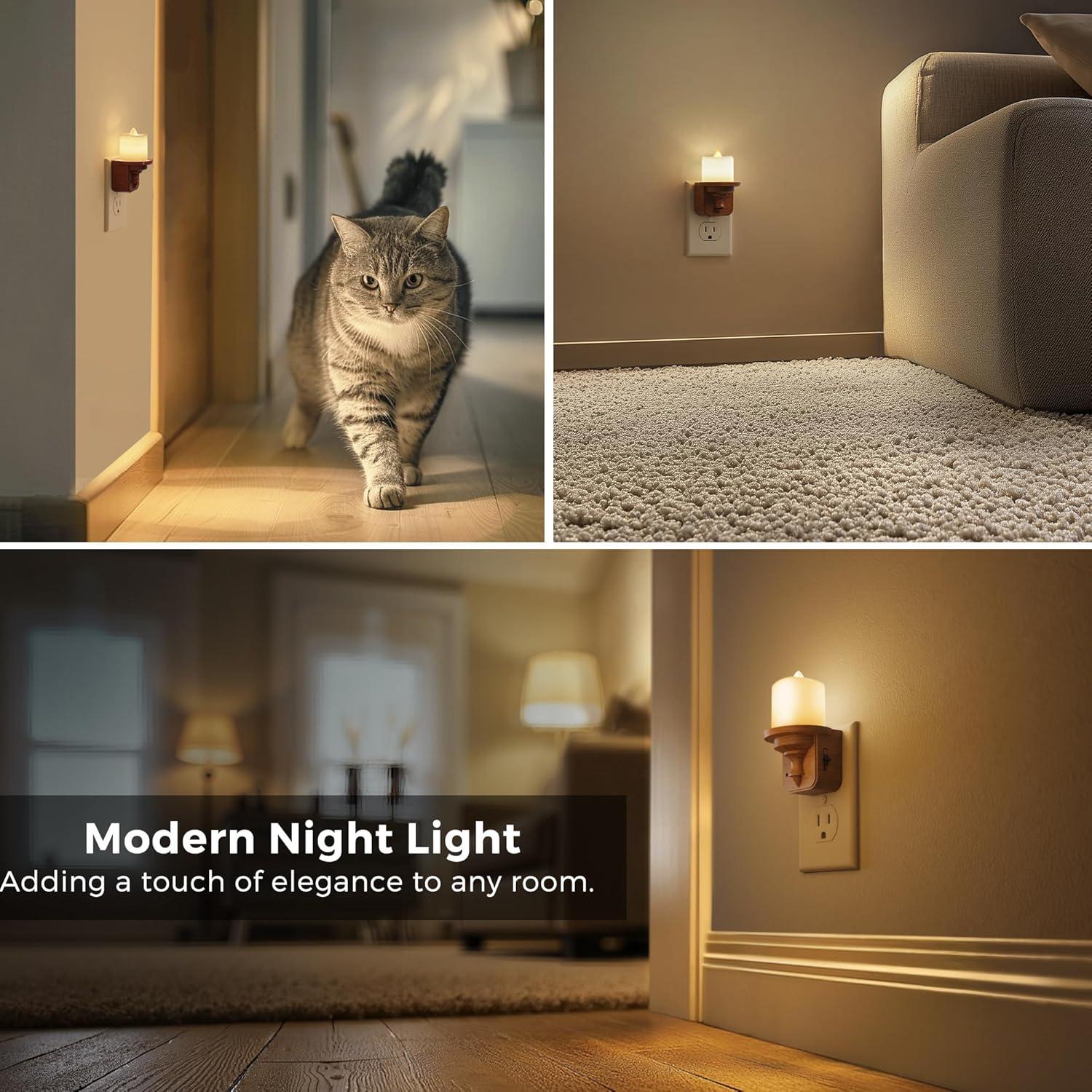 L LOHAS LED Night Light, 2Pack Transparent Candle Night Lights Plug into Wall, Amber Nightlight with Light Sensor, Flameless Fake Candles, 0-100LM Dimmable Decorative Nightlights for Hallway Bedroom(Woodgrain-Soft White)