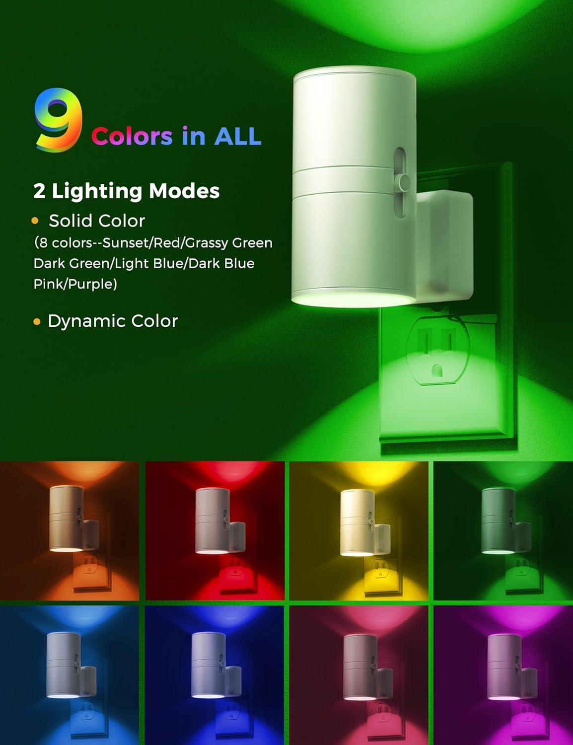 Color Changing Night Lights with 2 Modes — Solid Color + Multicolor: The solid color mode allows you to choose your favorite color from 8 static single colors. The multicolor mode will auto cycle through the 8 colors.