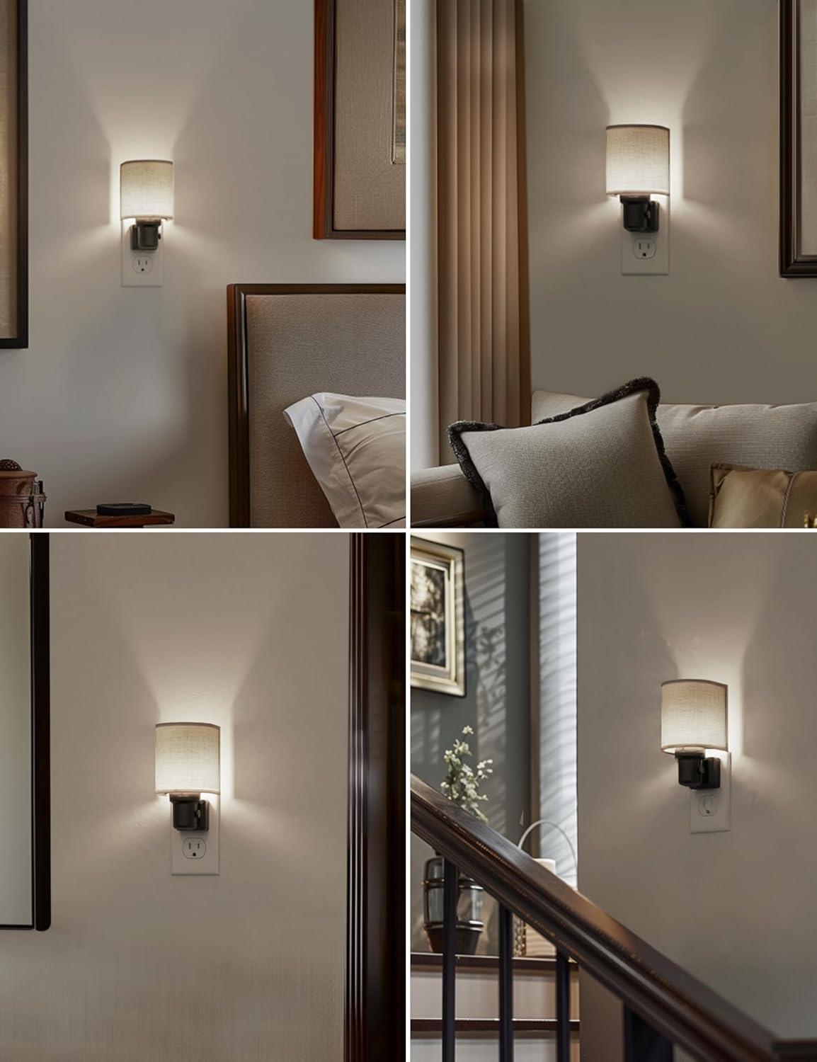 Featuring a high-quality beige fabric shade, this vintage night light can be used in hallways, bedroom, bathroom, kitchen, stairway, etc.
