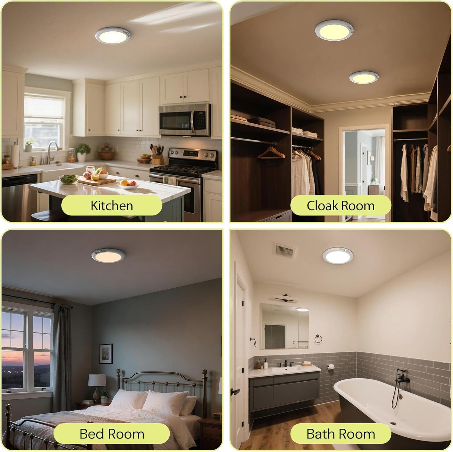 【Ultra-Thin Design & Dual Control Options】With a sleek, 0.5-inch ultra-thin body, this wireless ceiling light complements any modern home decor. It’s perfect for closets, showers, kitchens, stairways, hallways, laundry rooms, and sheds. Operate it easily using the press button or the included remote control — turn on/off, adjust brightness, switch light colors, or set timers effortlessly from anywhere in the room.