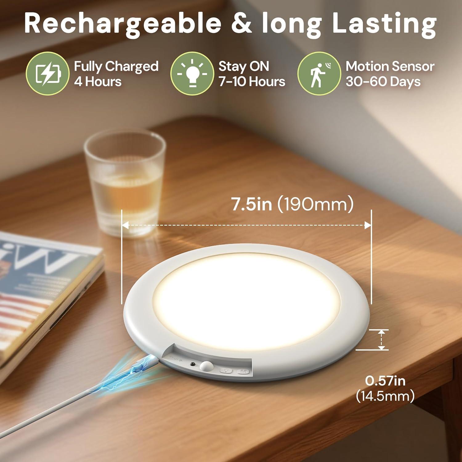 【Upgraded Rechargeable Motion Sensor Light】This motion ceiling light features a fast-charging battery and fully charges in just 6.5 hours. Lasting up to 103 days in motion sensor mode (10 activations/day) or 9 hours in Always-on mode at 100% brightness, this battery ceiling light ensures long-lasting, hassle-free lighting without frequent recharging