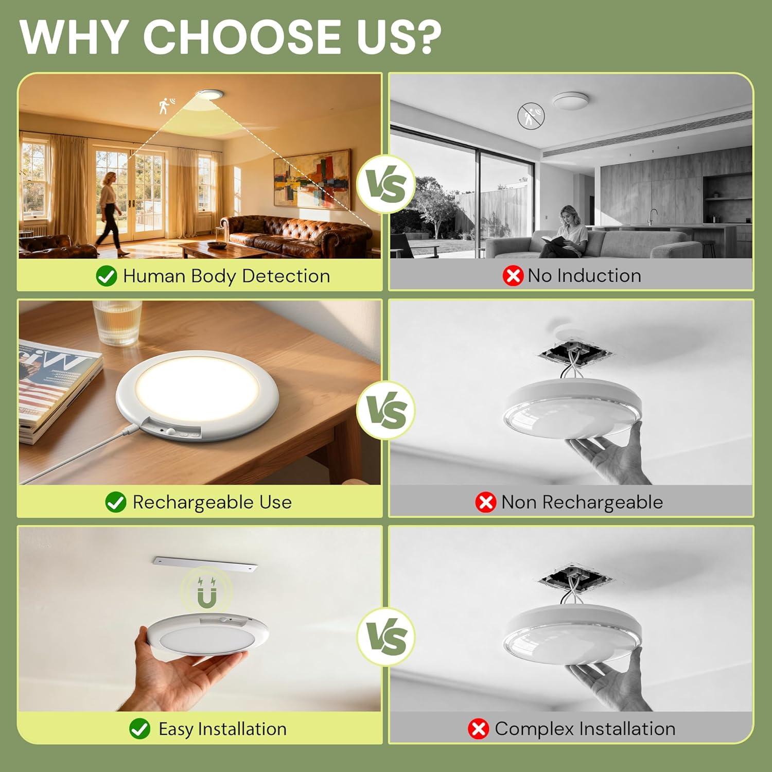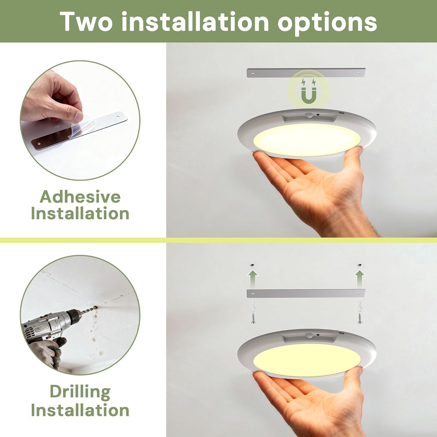 【3 Lighting Modes with Motion & Light Sensors】This battery operated ceiling light combines both motion detection and light sensing technologies for ultimate convenience. Choose from three intelligent modes:① Always-On Mode – continuous illumination;② All-Day Sensing Mode – automatically lights up whenever motion is detected, day or night;③ Night Sensing Mode – activates only in low-light conditions when motion is detected.Perfect for closets, hallways, stairs, sheds, and bathrooms, giving you sm
