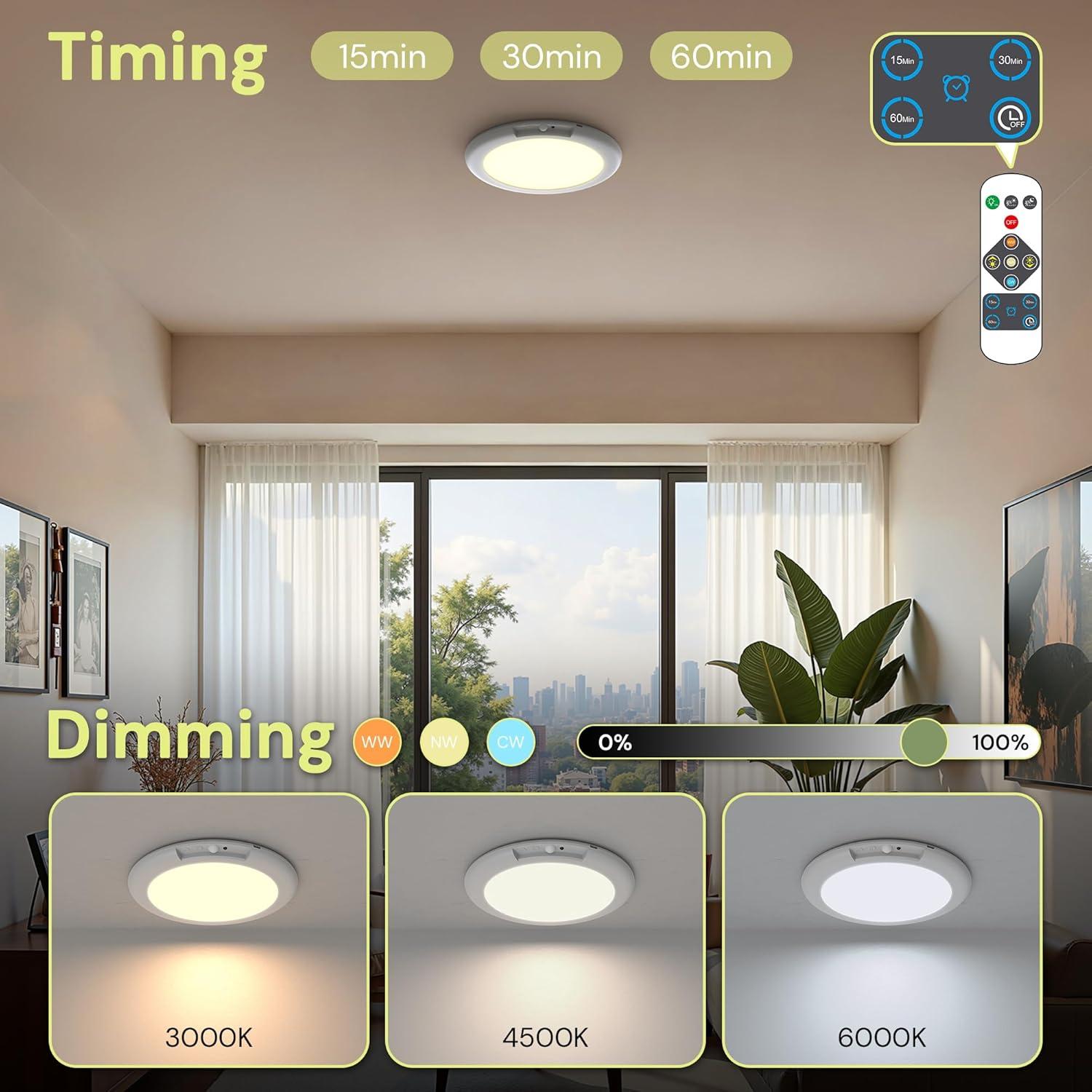 【3 Color Temperatures, Stepless Dimming & Timer Function】This motion sensor ceiling light enjoy customizable lighting for any occasion with 3 color temperatures — Warm White, Neutral White, and Cool White. Adjust brightness from 10% to 100% with stepless dimming to create the perfect ambiance. The built-in timer setting (15, 30, or 60 minutes) helps conserve energy while offering total control over your lighting experience.