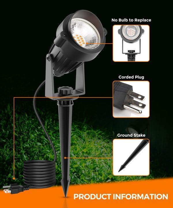 【Auto On/Off Landscape Lighting】Equipped with a sensitive dusk to dawn sensor, these spotlights outdoor automatically turn on at night and off during the day, providing steady 3000K warm white illumination while saving energy and reducing the need for manual operation